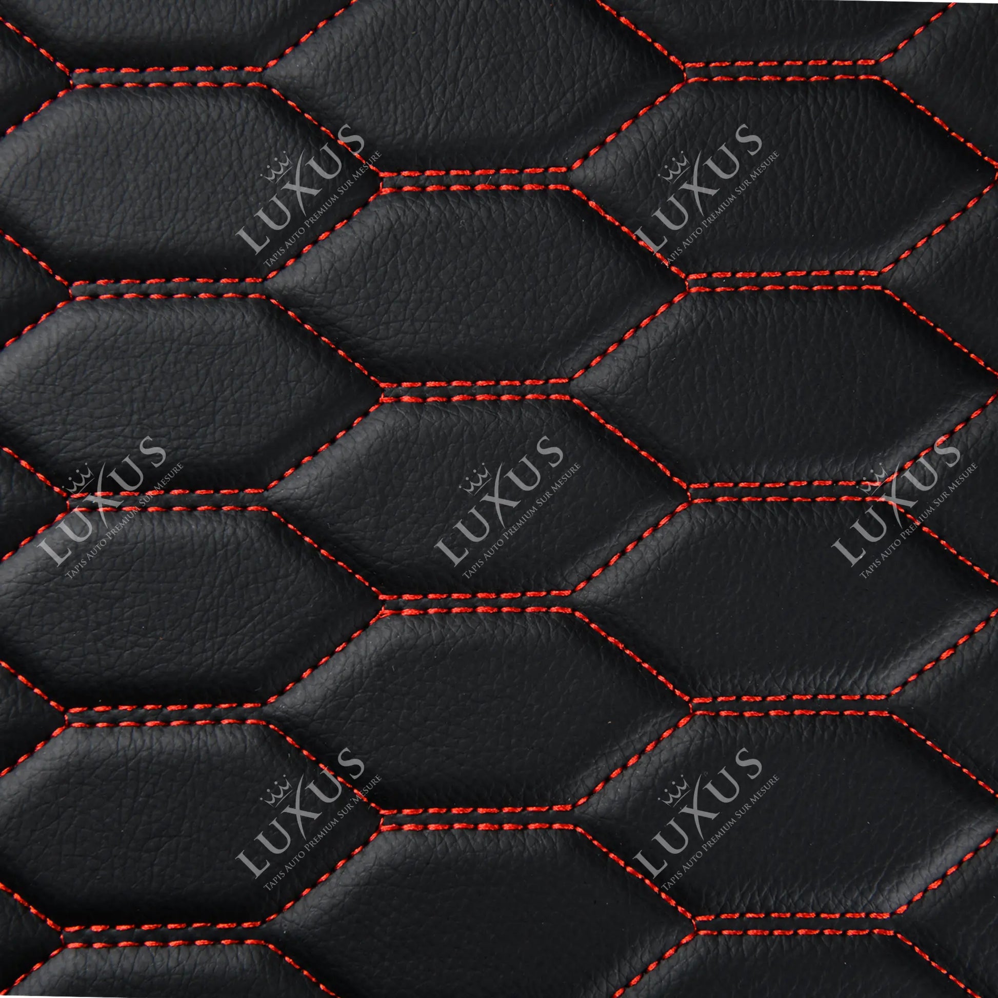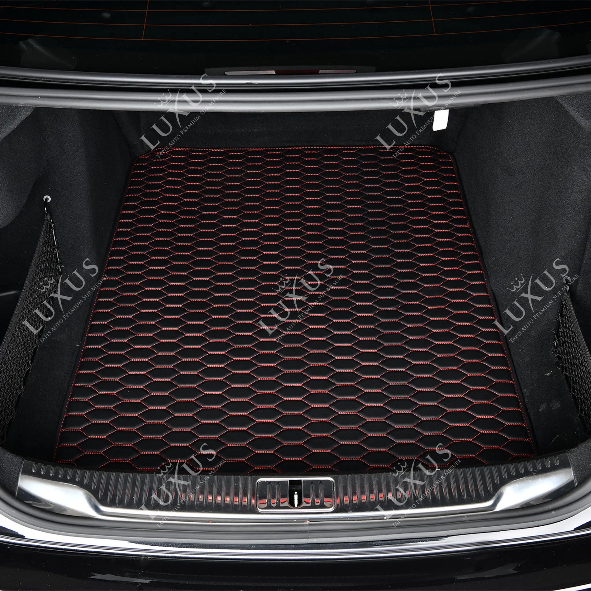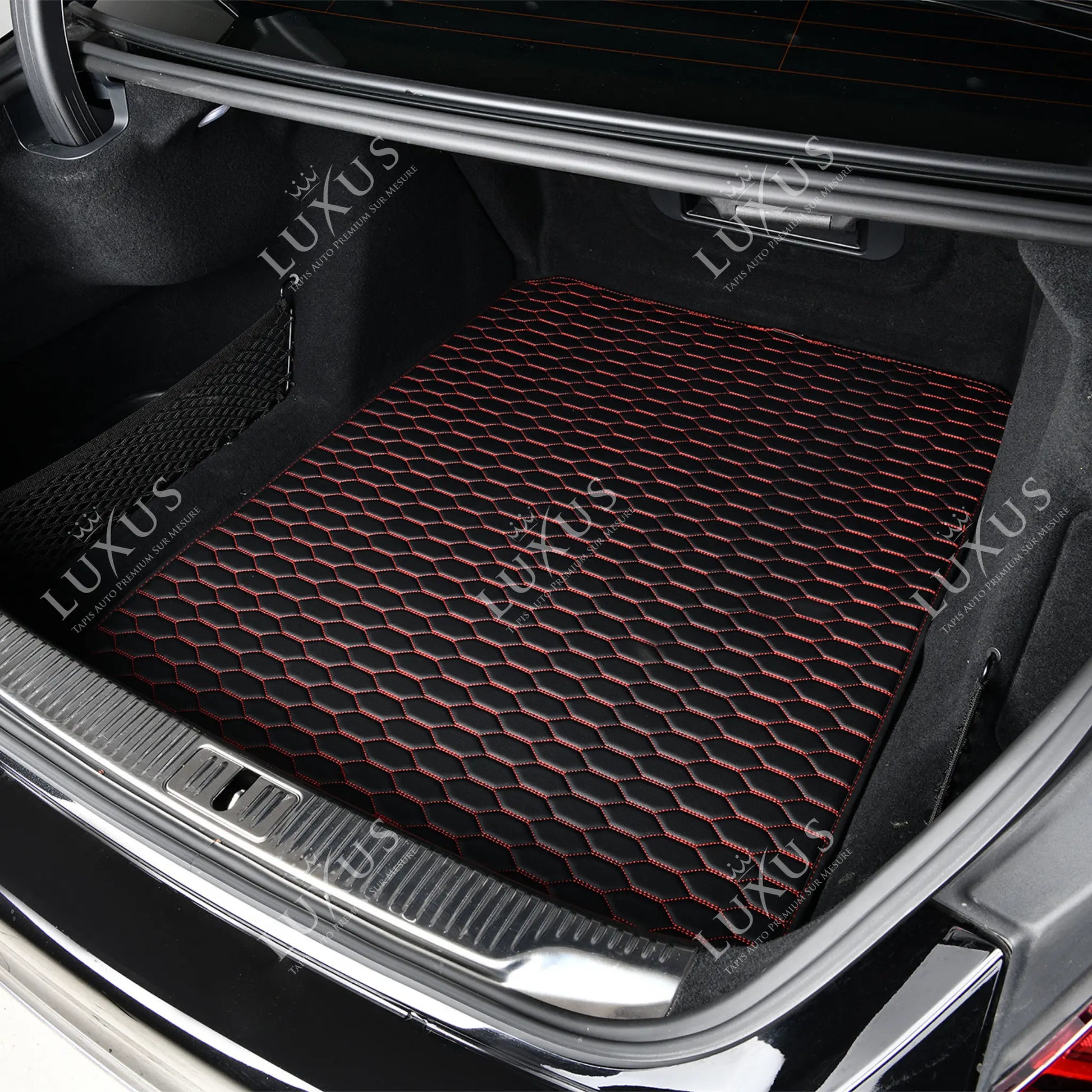 Tapis de Coffre sur Mesure Premium Luxus – Motif Nid d’Abeille Noir avec Surpiqûres Rouges