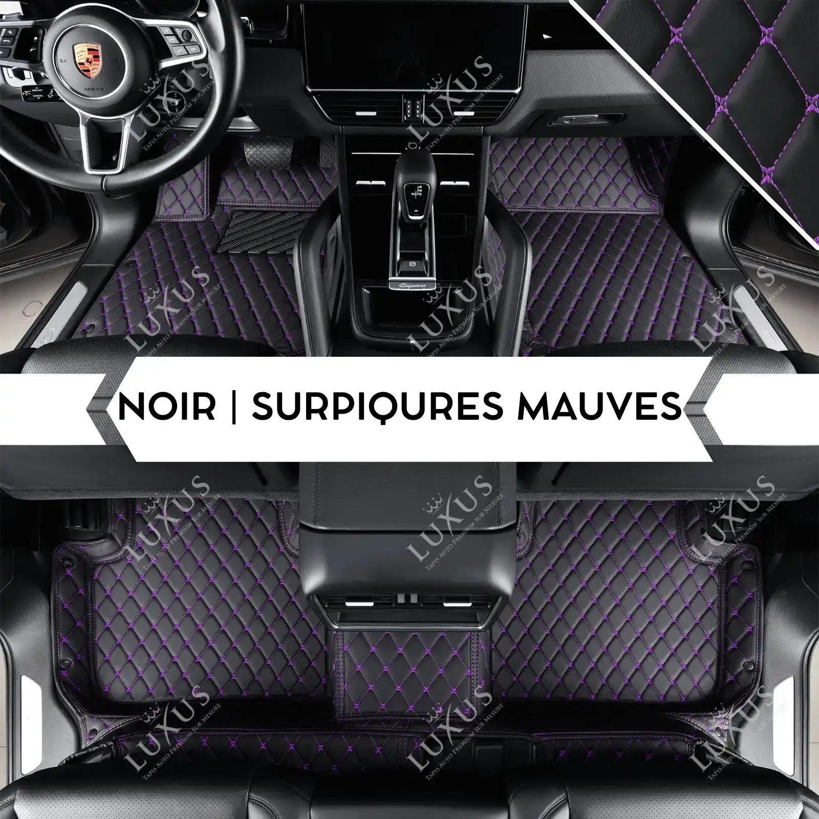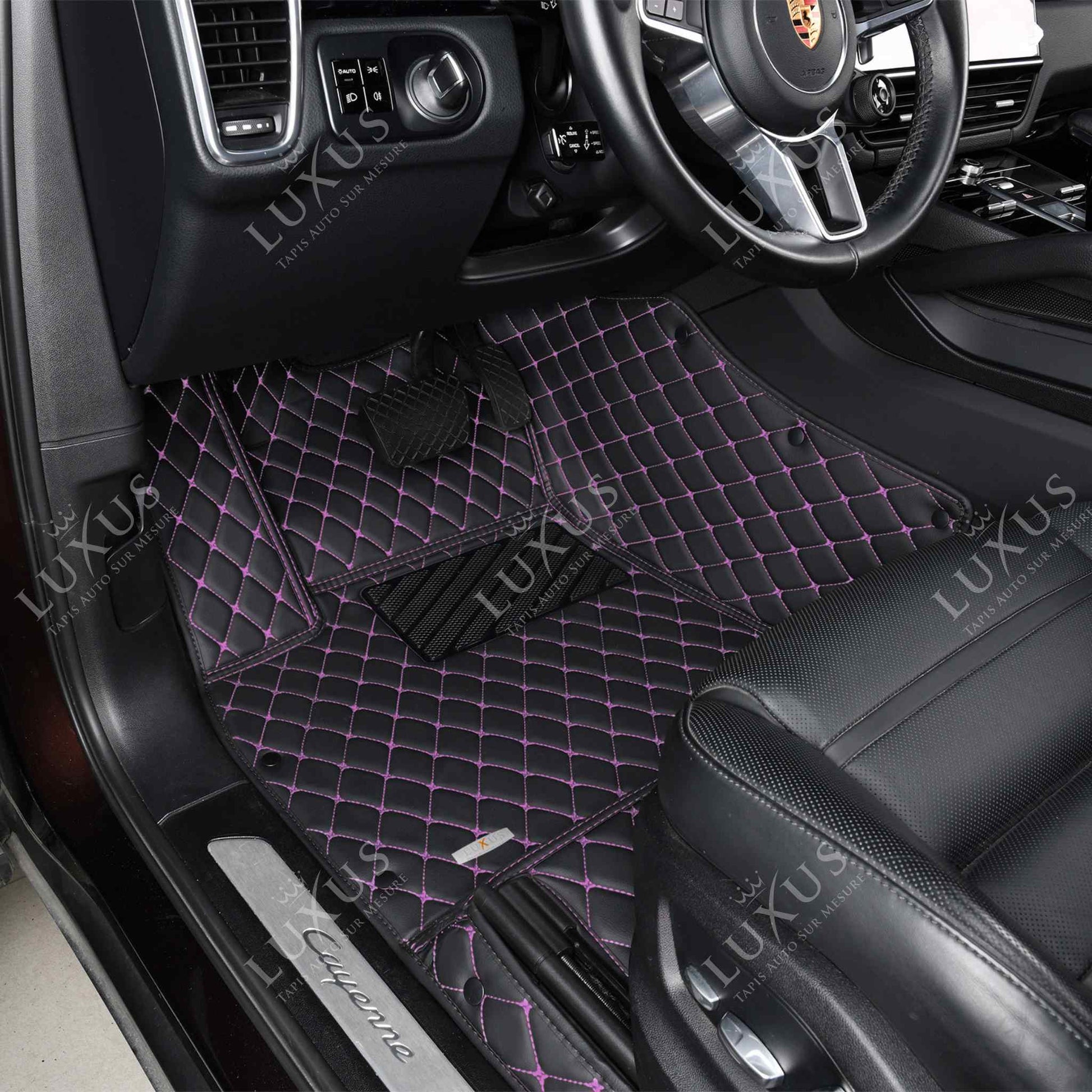 Tapis de Sol 3D Sur Mesure Premium Luxus – Motif Losange Noir avec Surpiqûres Mauves