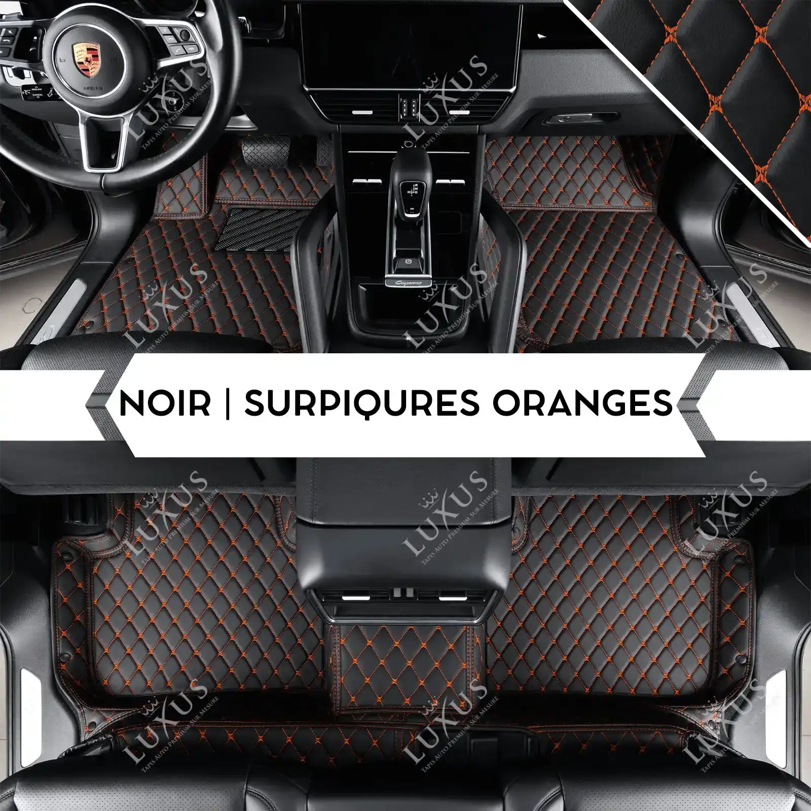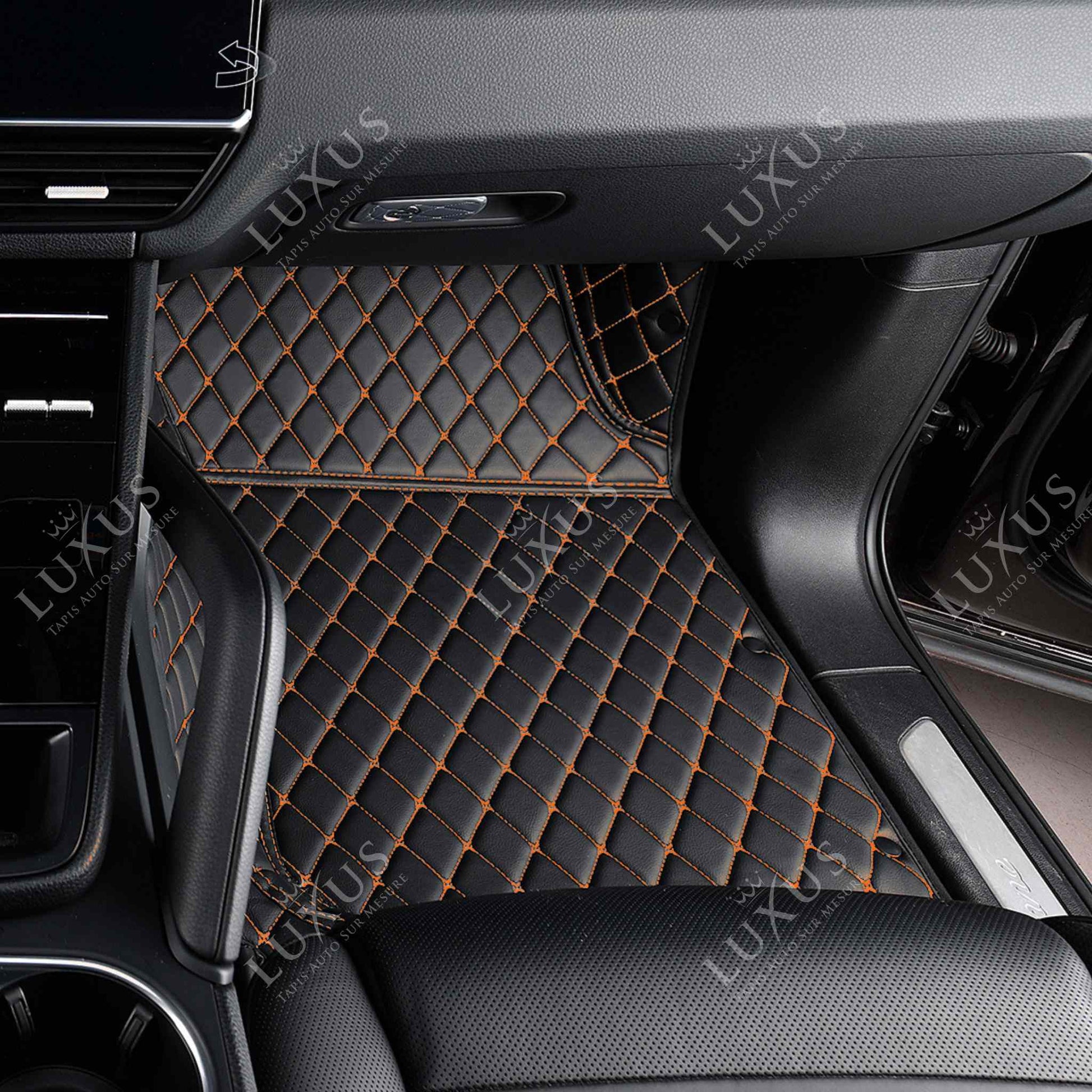 Tapis de Sol 3D Sur Mesure Premium Luxus – Motif Losange Noir avec Surpiqûres Oranges